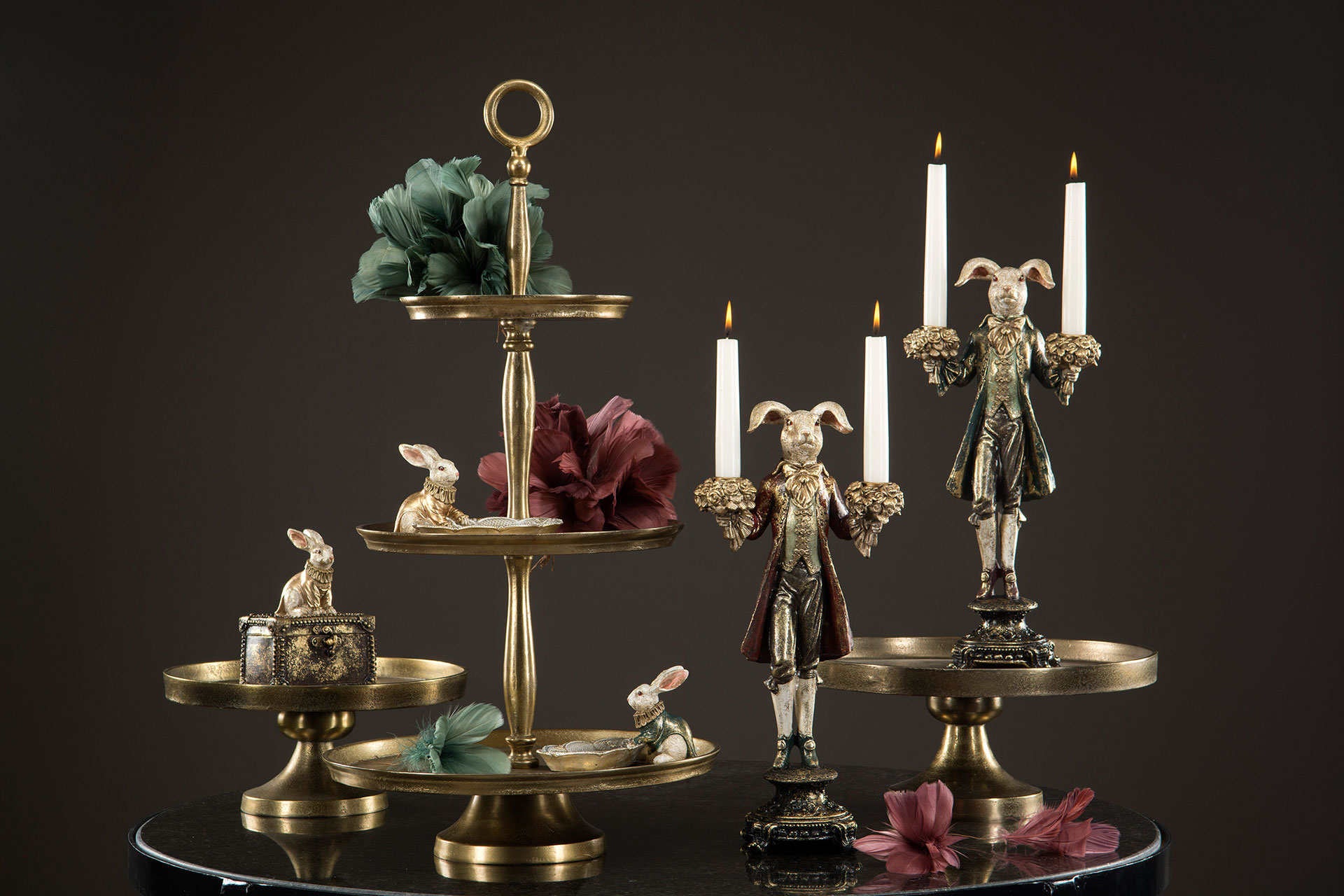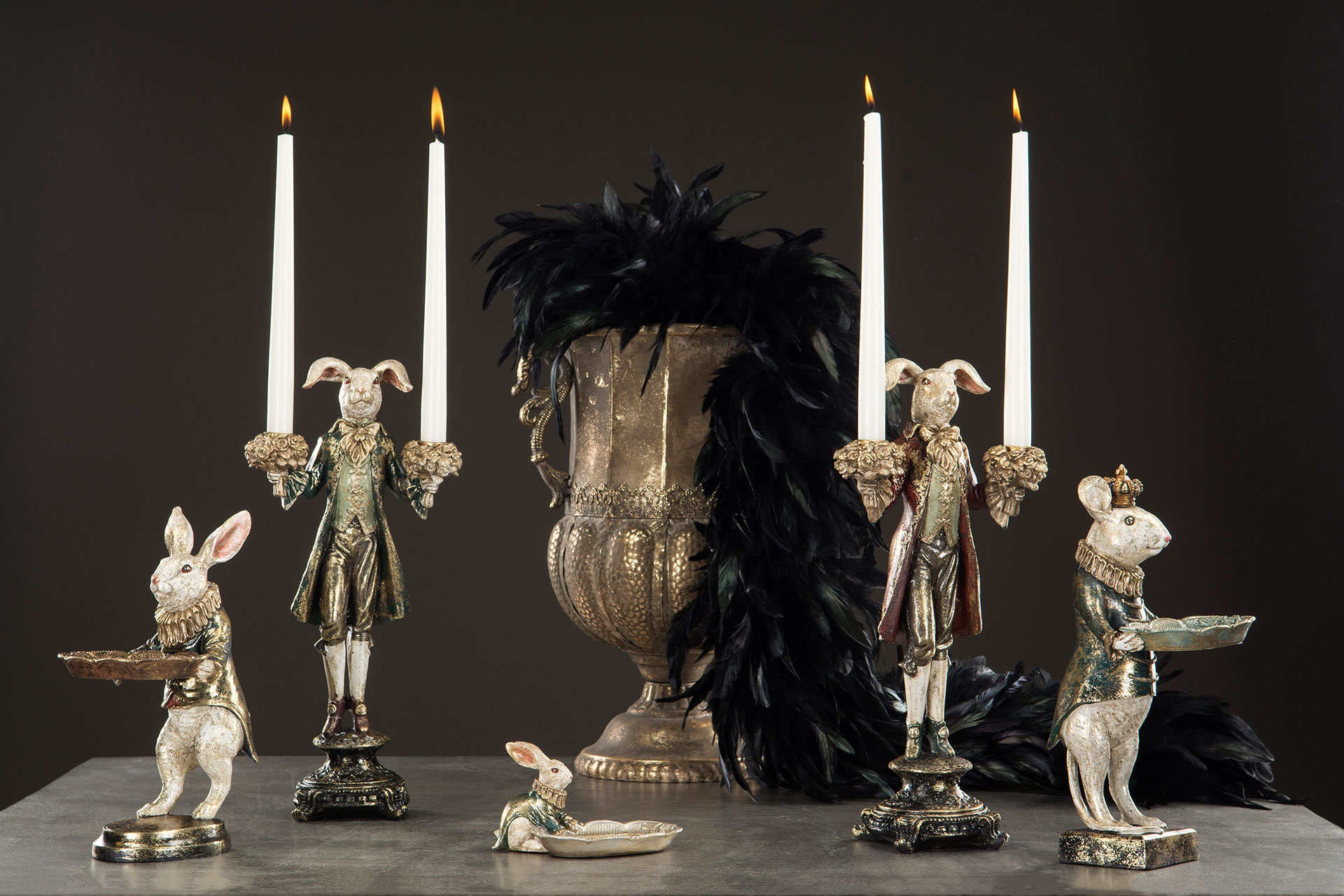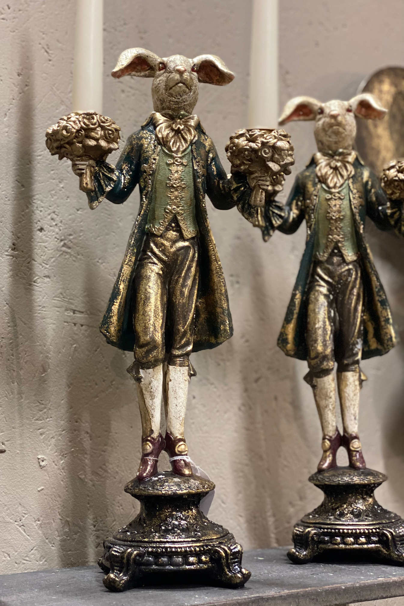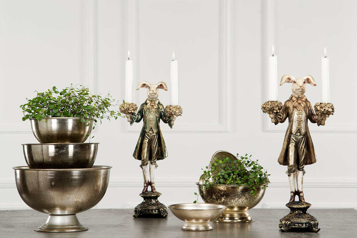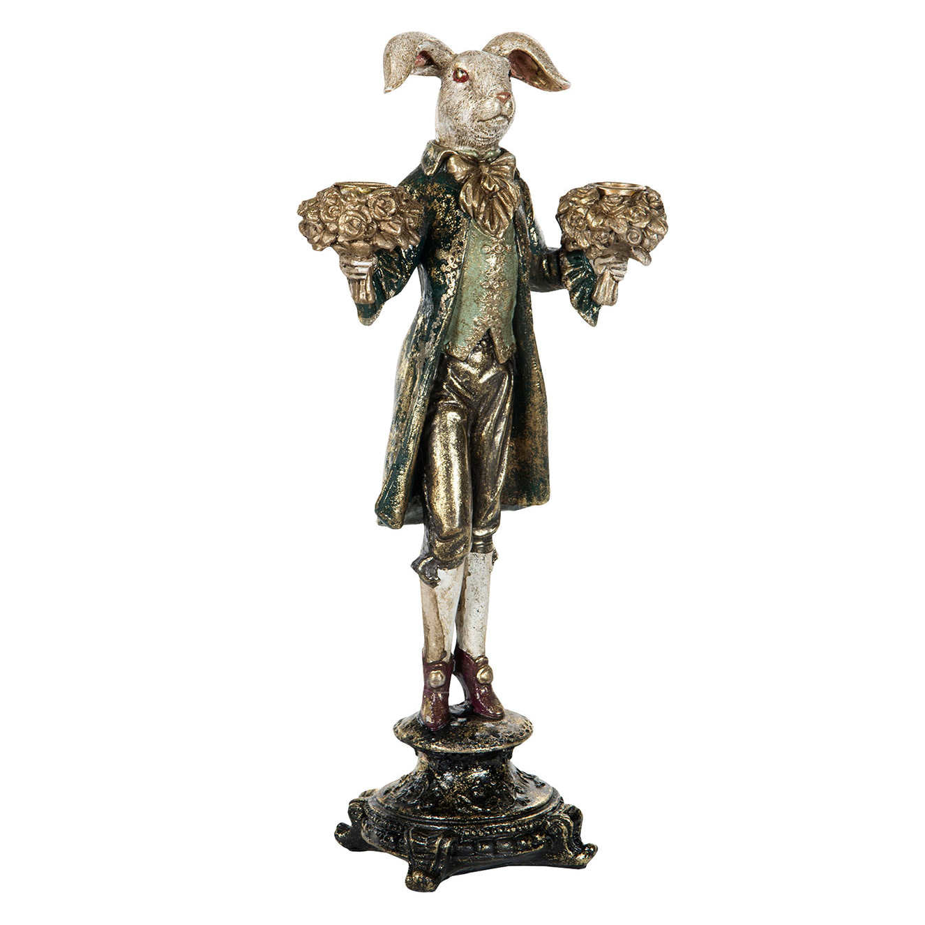 Komea pupu kynttilänjalka. Pupu on pukeutunut kultakoristeltuun barokkityyliseen vihreään takkiin. Jokainen pupu on persoonallinen ja hieman erilainen väritykseltään ja viimeistelyltään. Pupun molempiin käsiin voi asettaa kruunukynttilät. Kynttilänjalan korkeus on noin 40 cm. Patsas on valmistettu polyresiinistä. Saatavana myös kultatakkinen kani.