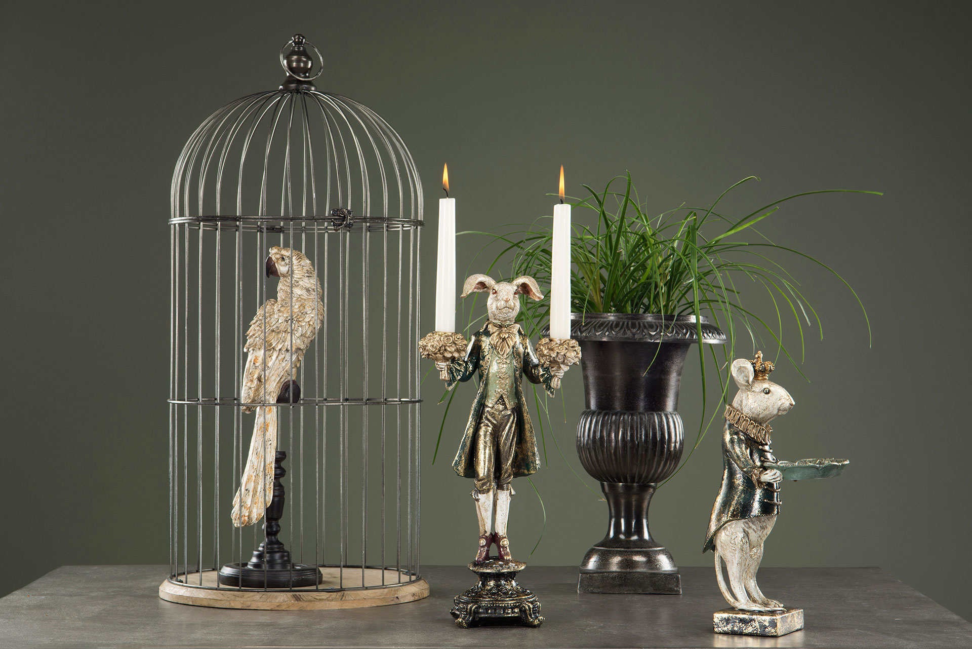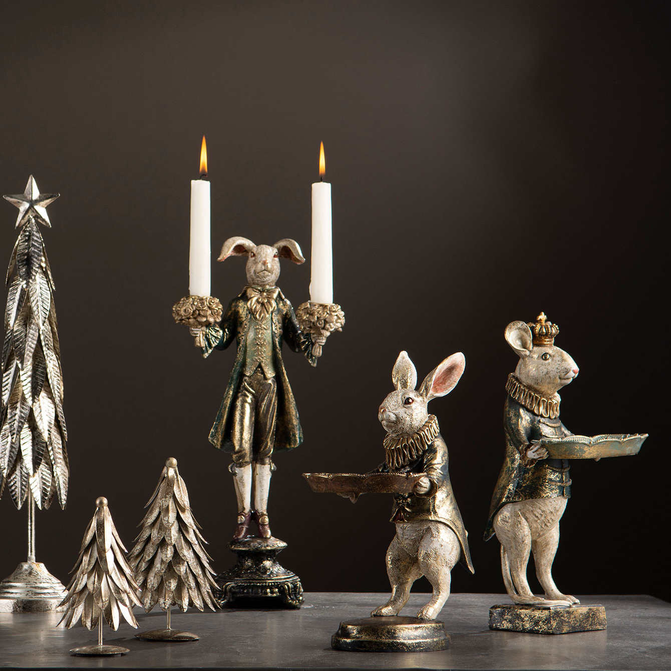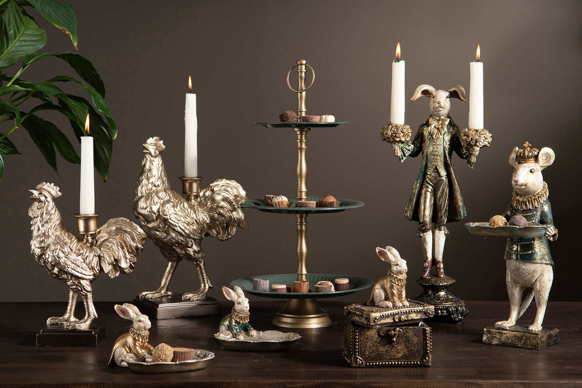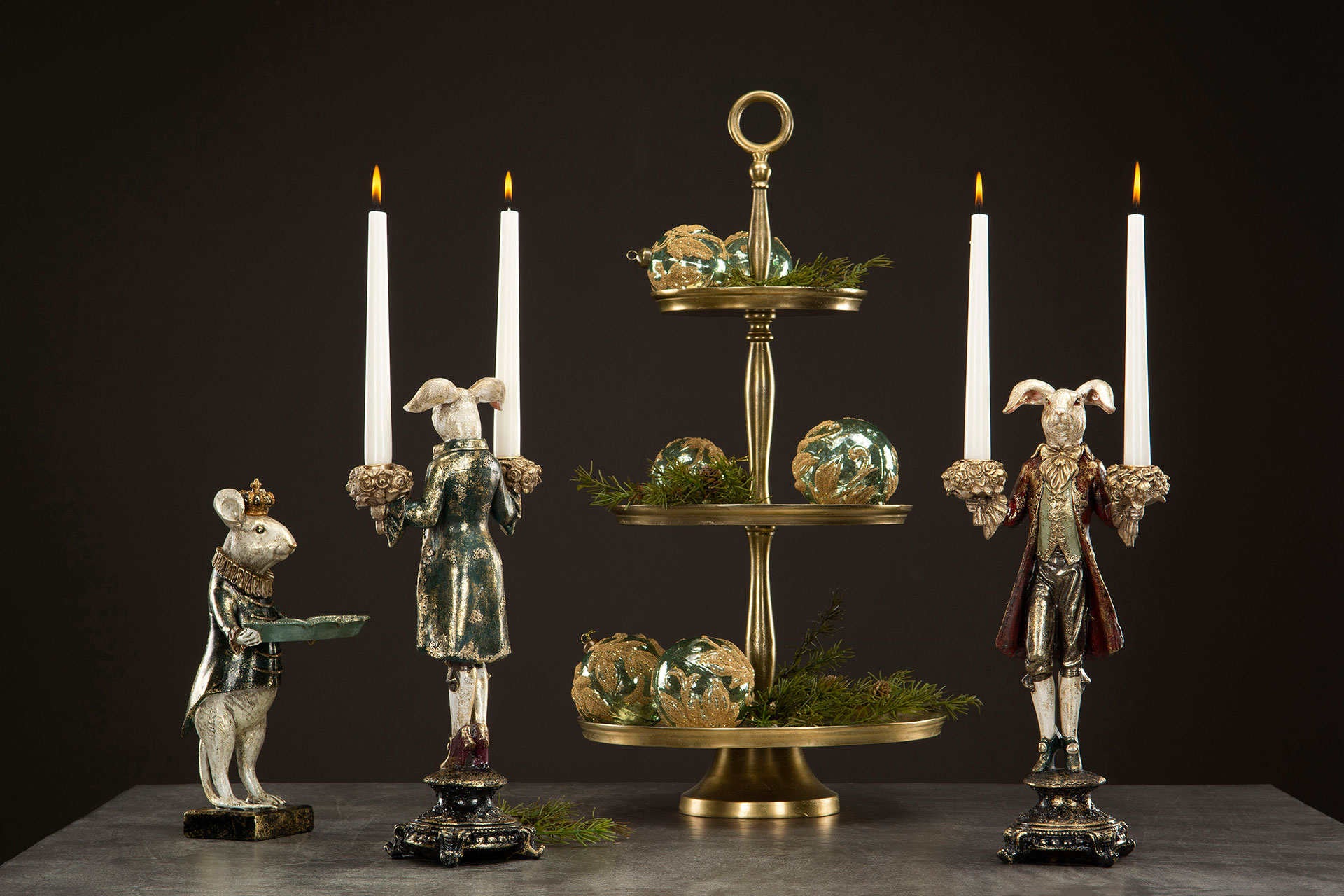 Komea pupu kynttilänjalka. Pupu on pukeutunut kultakoristeltuun barokkityyliseen vihreään takkiin. Jokainen pupu on persoonallinen ja hieman erilainen väritykseltään ja viimeistelyltään. Pupun molempiin käsiin voi asettaa kruunukynttilät. Kynttilänjalan korkeus on noin 40 cm. Patsas on valmistettu polyresiinistä. Saatavana myös kultatakkinen kani.