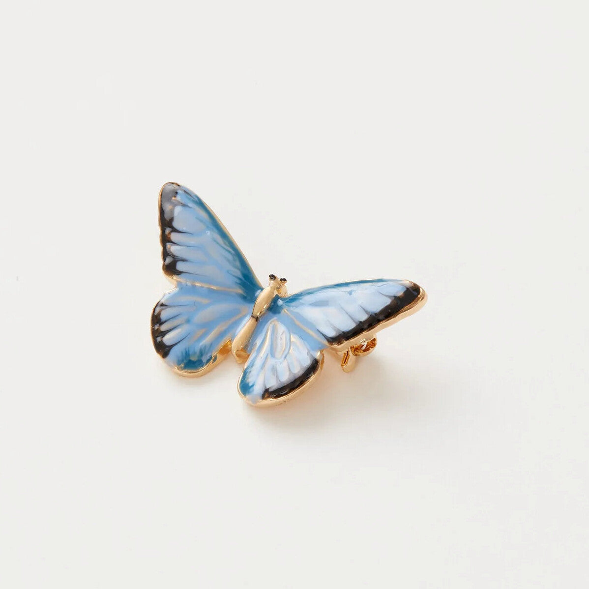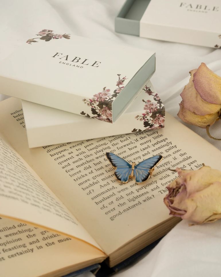 Kaunis sininen perhonen rintakoru. Koru on valmistettu kullalla päällystetystä metallista. Perhonen on maalattu käsin, joten jokainen koru on viehättävästi hieman eri näköinen oma yksilönsä. Fable England korut tuovat asuusi tyylikkäällä ja hauskalla tavalla englantilaista menneiden aikojen tunnelmaa.