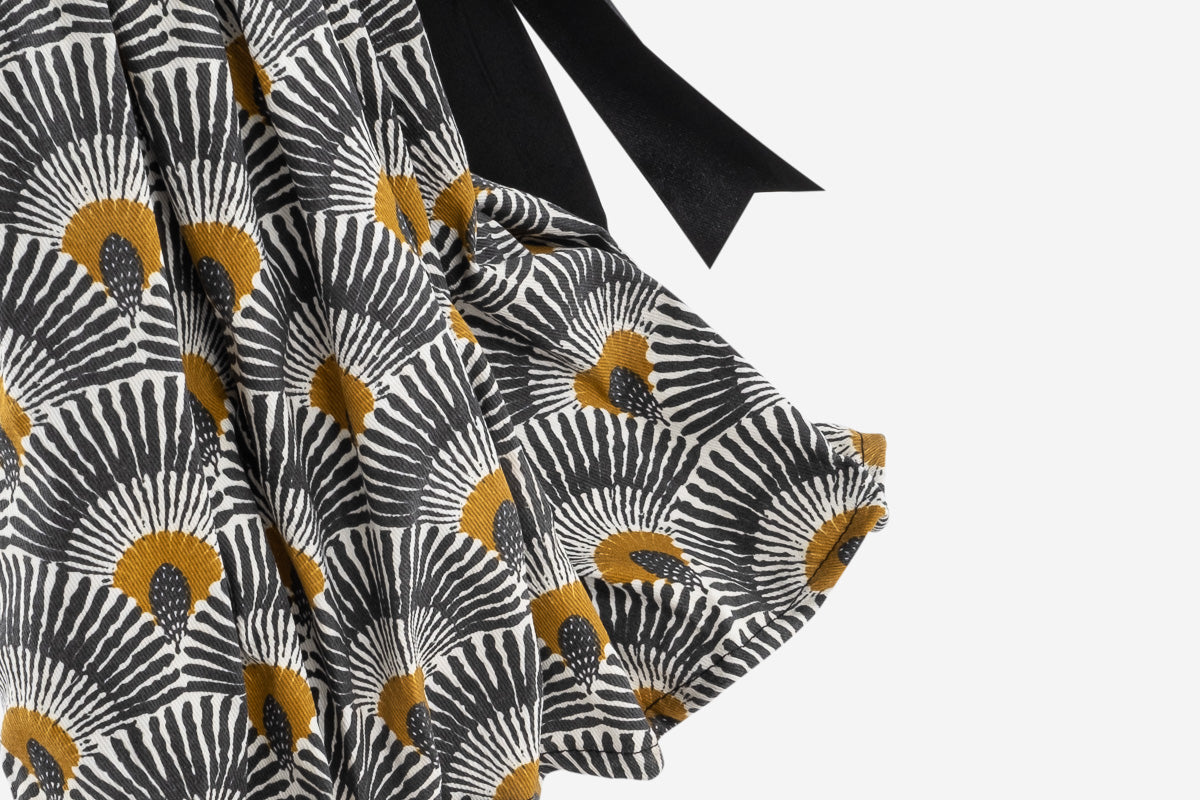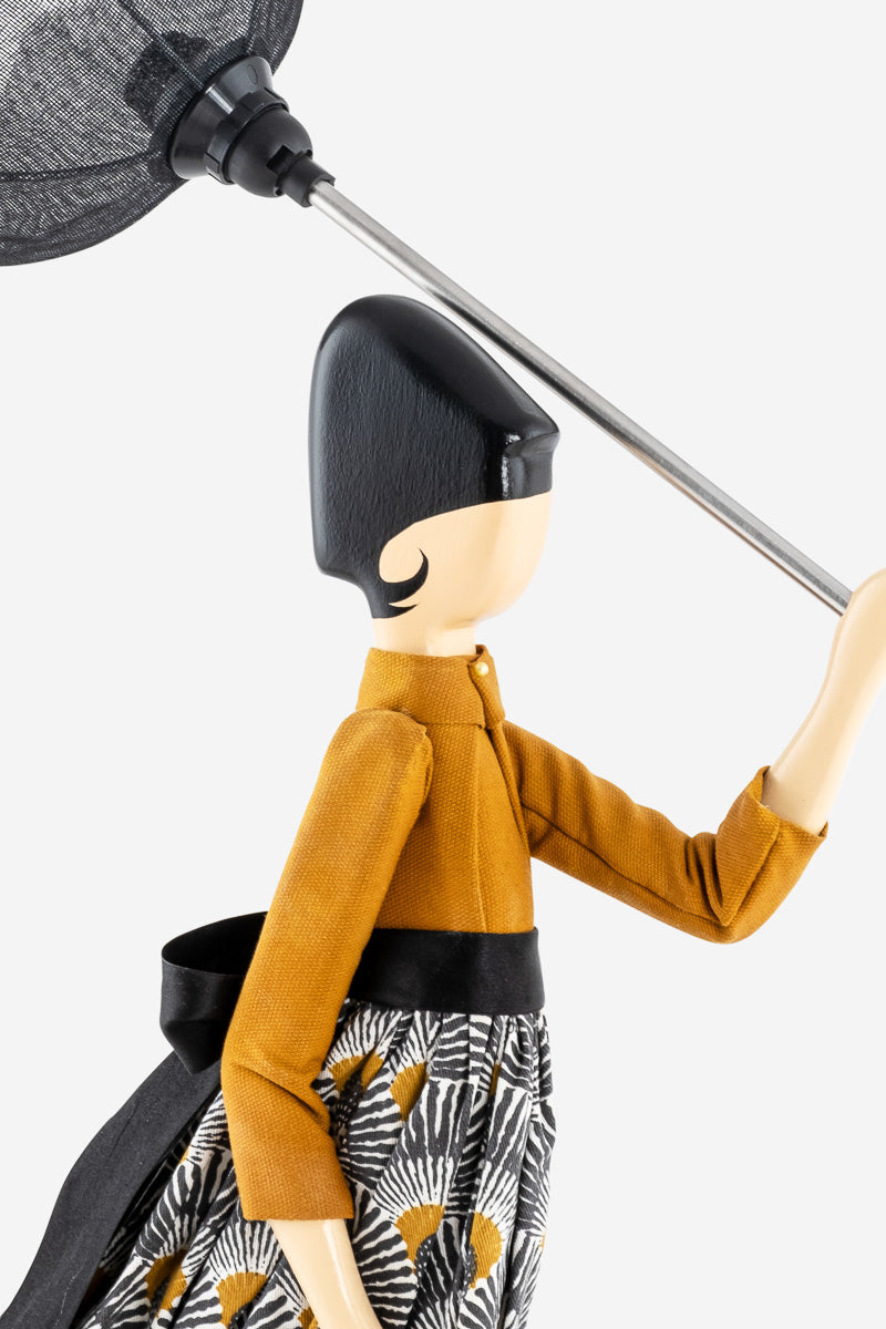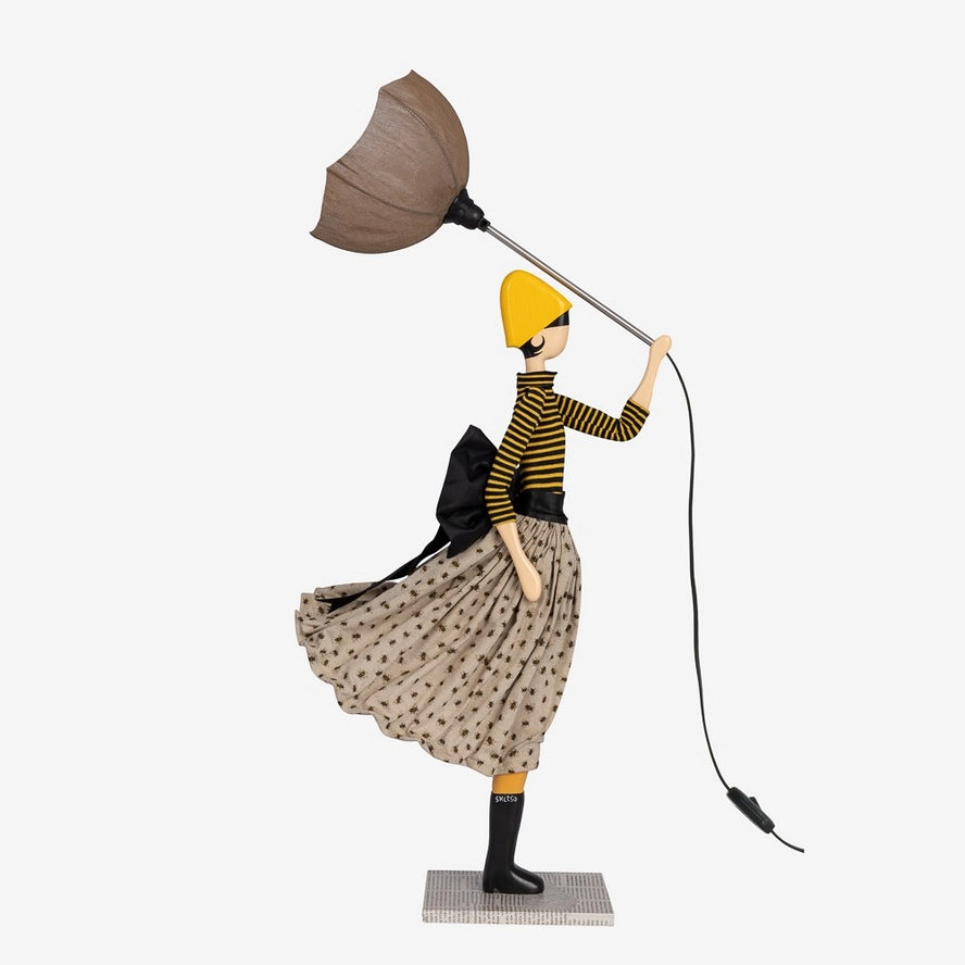 Tässä on Chryslia, Little Girl sarjan ihastuttava valaisin. Chryslialla on päällään hulmuavahelmainen mustan ja okrankeltaisensävyinen hame. 80 cm korkea valaisin on näyttävän kokoinen, mutta silti kauniin siro ja sopusuhtainen. Kivana yksityiskohtana valaisimen jalusta on päällystetty kreikkalaisilla sanomalehden sivuilla.